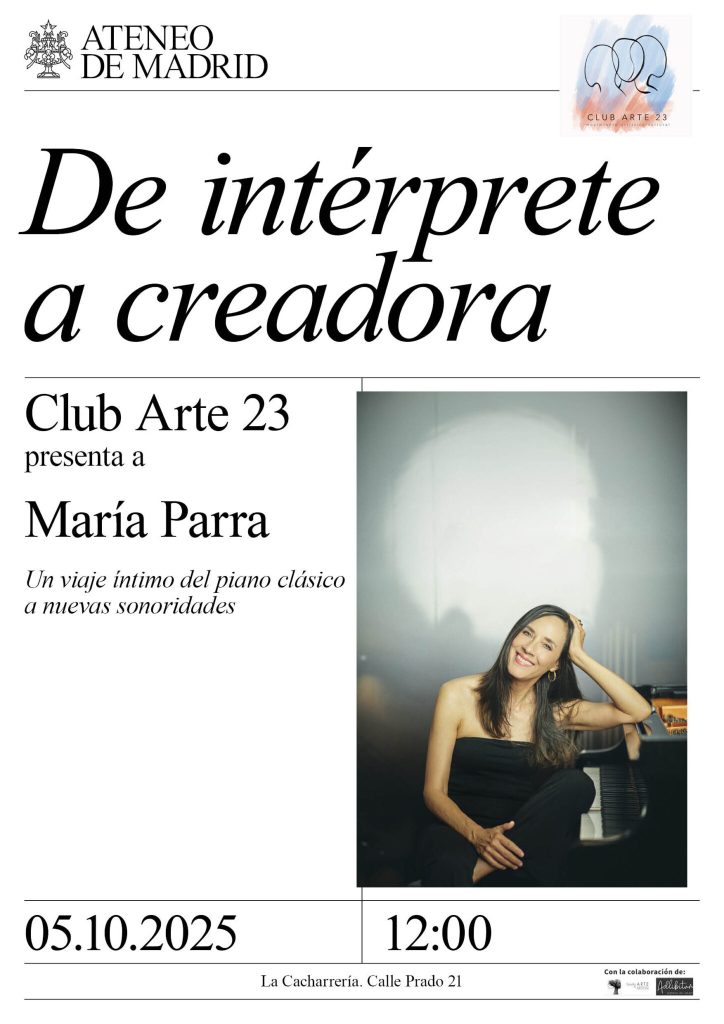 María Parra ofrecerá un concierto-conferencia en la Sala La Cacharrería del Ateneo de Madrid, en colaboración con la Asociación Cultural CLUB ARTE 23. Este concierto será muy especial ya que María Parra hará un repaso autobiográfico de su trayectoria, de como ha pasado de ser intérprete a creadora.